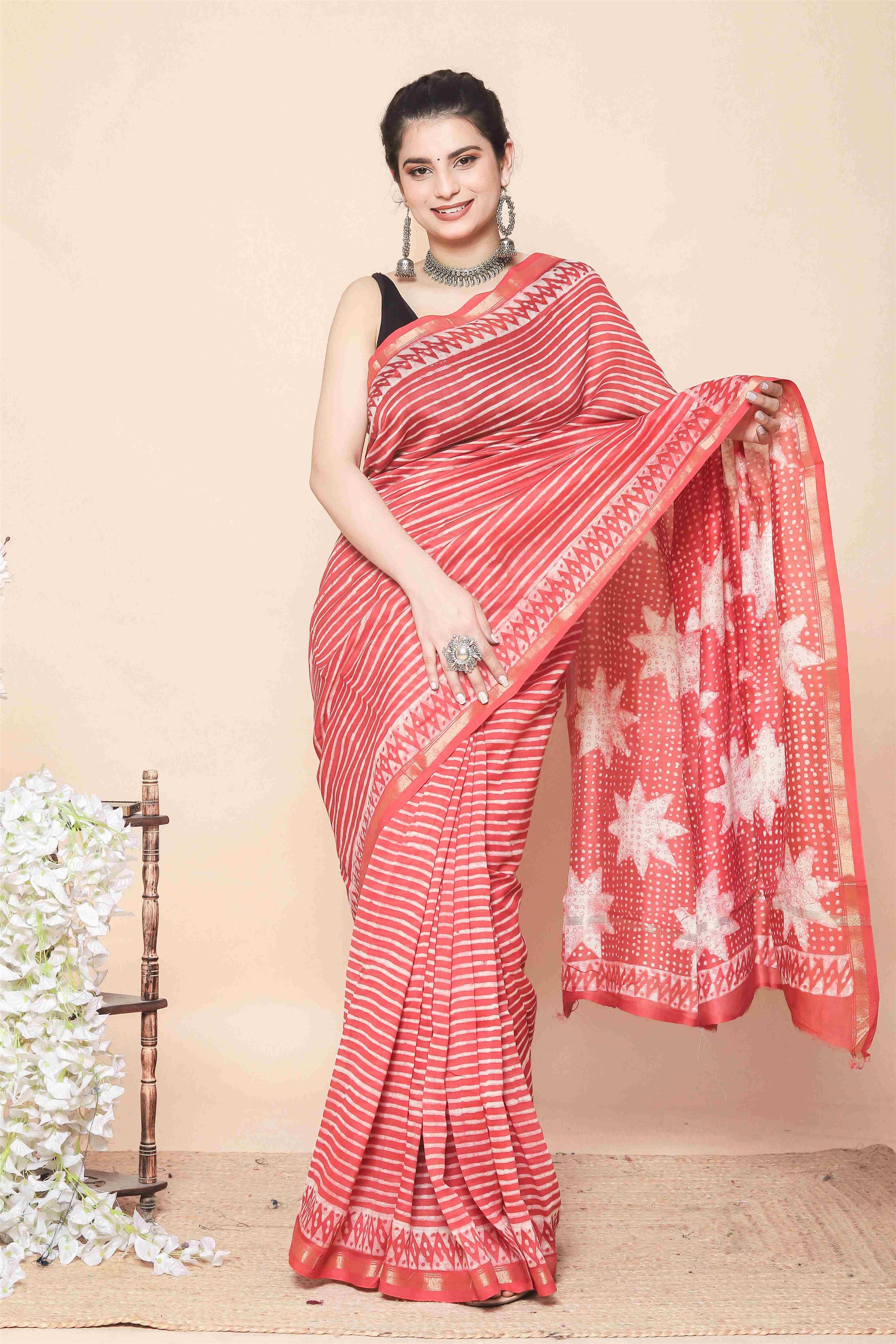 The saree is coral/reddish-pink with white patterns. It has stripes and geometric patterns along with star and polka dot designs ??