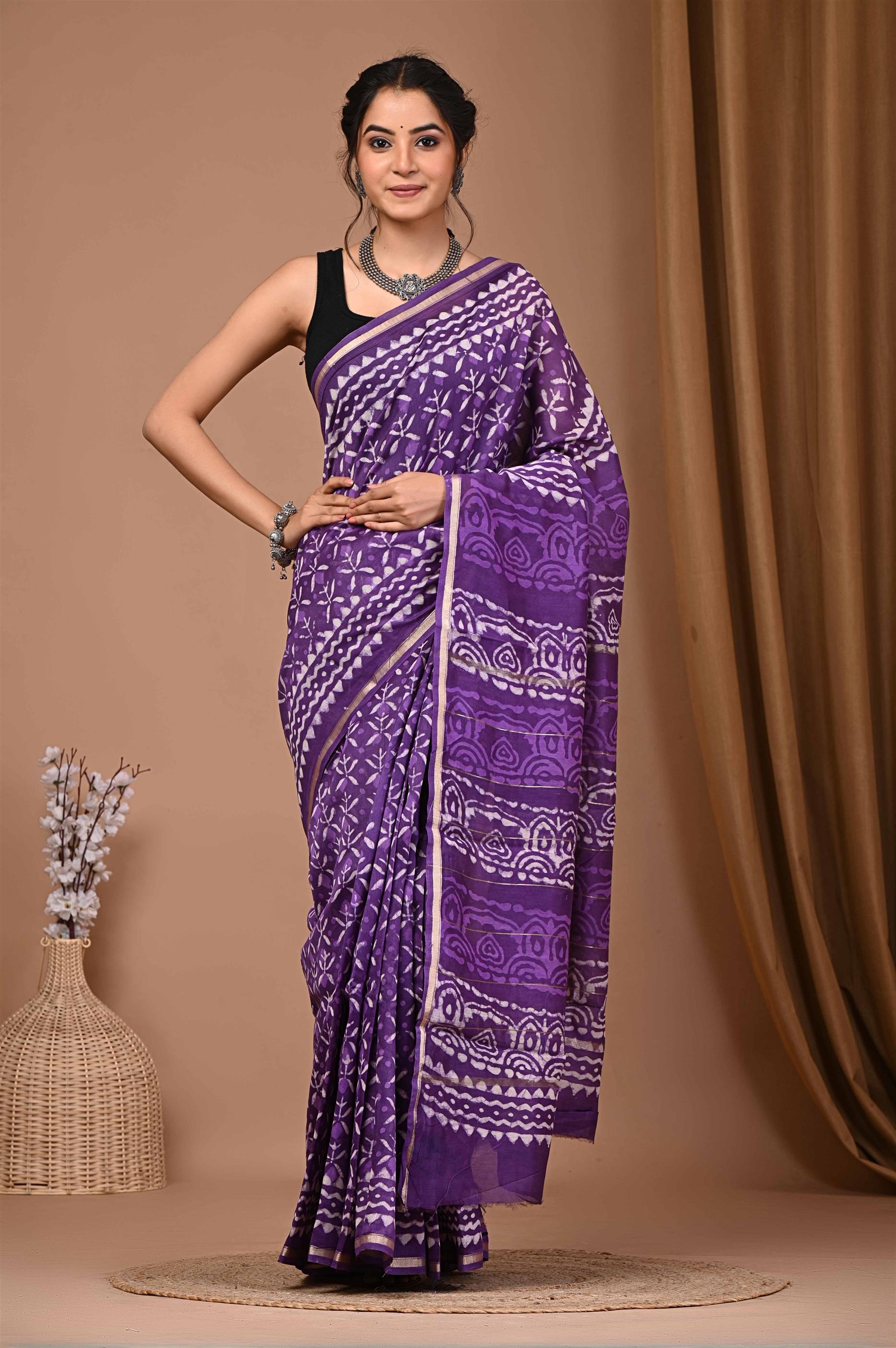 The woman in the image is posing confidently in a stunning purple saree with intricate white patterns. She's wearing a black sleeveless blouse and accessorized with silver jewelry like a necklace, earrings, and a bracelet ??. Her dark hair is styled in an updo. The backdrop is a warm tan color with a brown curtain on the right and a wicker vase with white flowers on the left ??. She's standing on a round jute mat, adding to the ethnic vibe ??.
