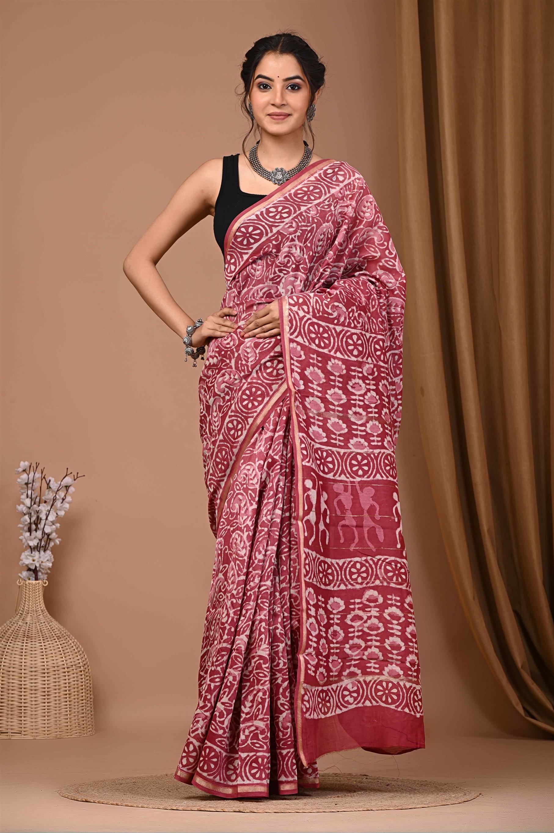 The saree is a maroon-colored traditional Indian garment with intricate white patterns. It features various designs like circles, geometric shapes, and possibly some cultural motifs. The saree is draped elegantly on the woman, paired with a black sleeveless blouse and complemented by silver jewelry.