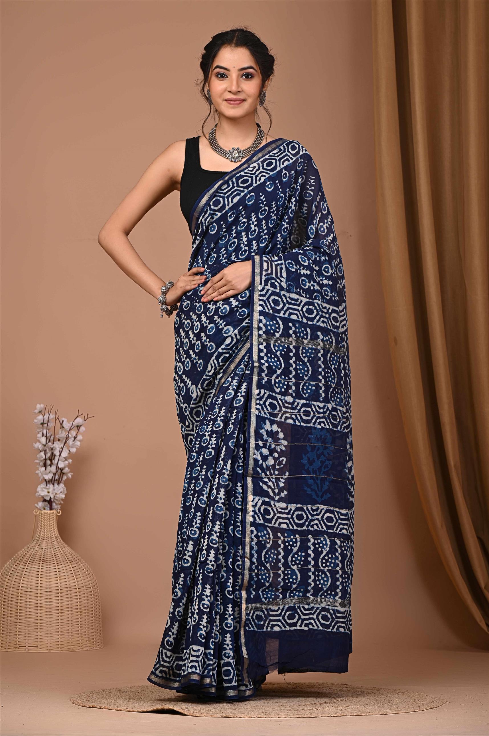 The saree is blue with intricate white patterns and designs all over it. It has a darker blue border at the bottom. The saree is draped elegantly on the woman, paired with a black sleeveless blouse. Silver jewelry like a necklace and bracelet complement the outfit.