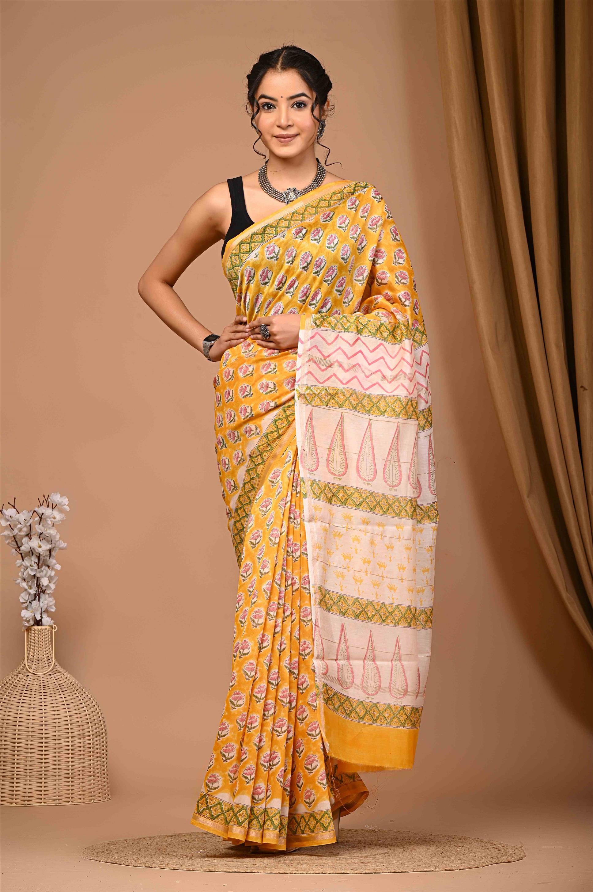 The saree is a vibrant yellow with a mix of patterns and designs. It features floral motifs in pink and green hues across the body of the saree. The pallu showcases a combination of patterns including zigzags, teardrop shapes, and other geometric designs in pink, green, and white on a light pink background. The saree has a yellow border at the bottom with green accents, adding to its traditional and elegant appeal.