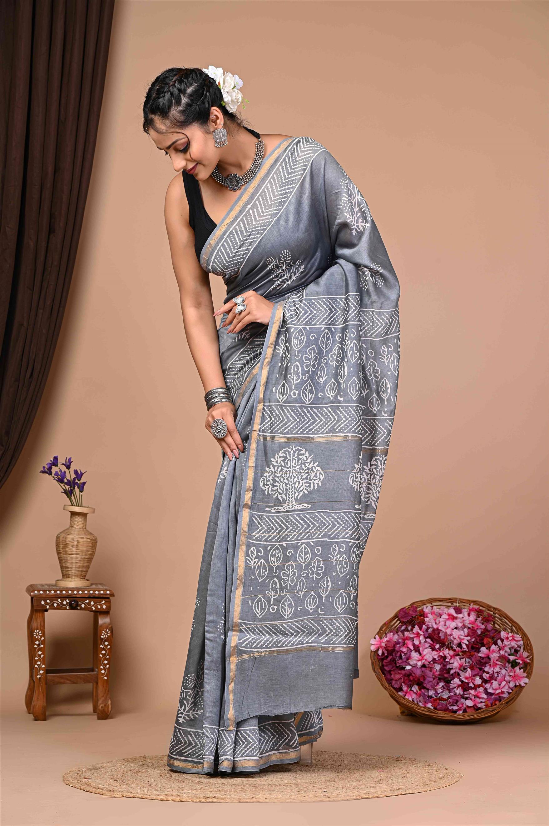 The saree is a grey batik saree with white designs and gold borders. It has intricate white batik patterns on a grey base, giving it a classic and ethnic look.