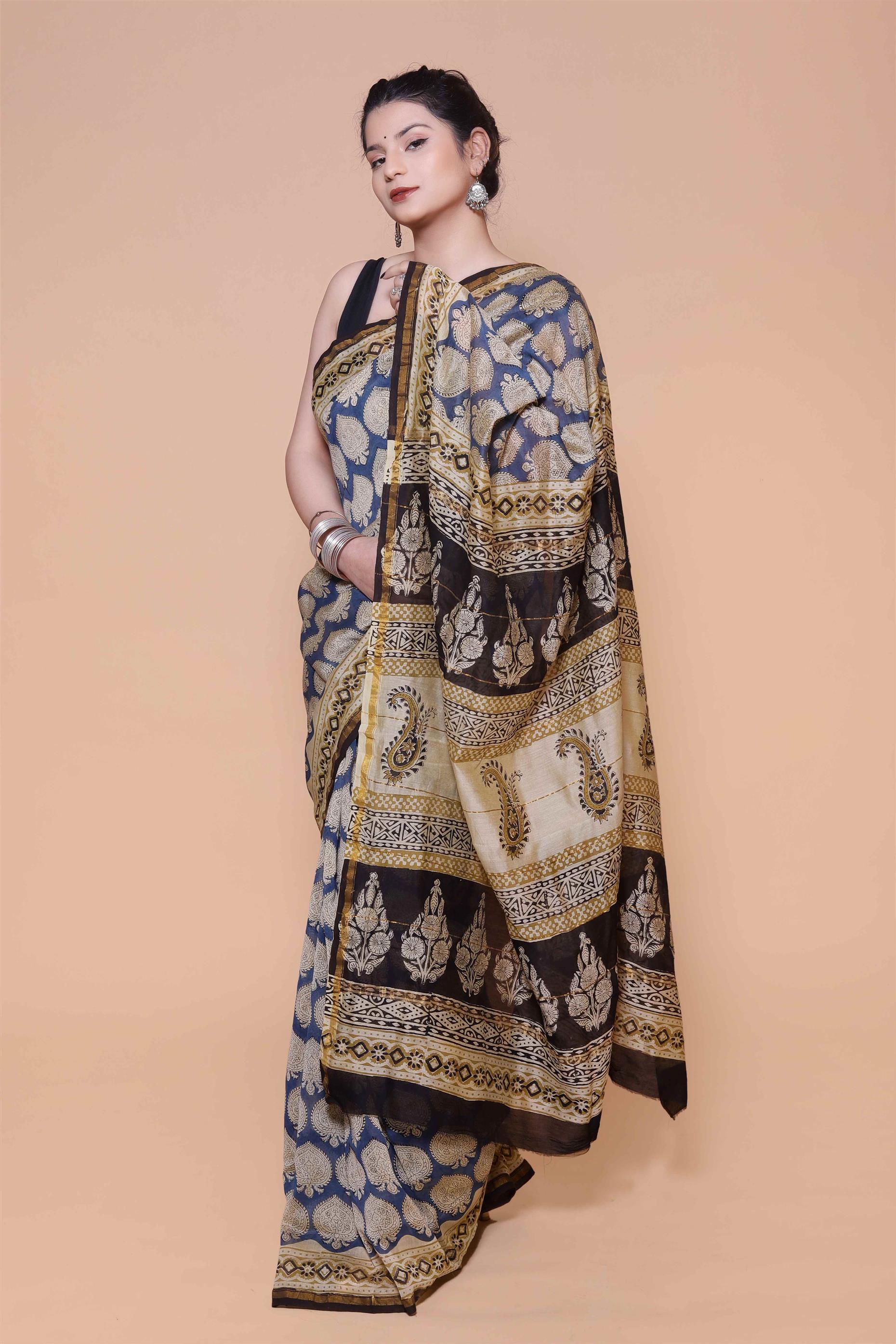 WOMENS BLUE BLACK CHANDERI SILK SAREE