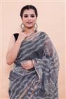The saree in the image is grey with intricate white embroidery patterns. It has a gold border along the edges, adding a touch of elegance. The saree is draped traditionally by the woman in the photo. ??