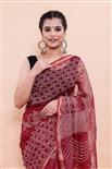 The saree is red with intricate white embroidery. The embroidery features geometric patterns like triangles and lines, along with some floral motifs. The saree is draped elegantly by the woman, and she has paired it with a black sleeveless blouse. ??