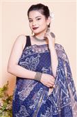 The saree in the image is blue with white and gold patterns. It has a mix of designs like paisley motifs, zigzags, and other intricate patterns. The saree looks like it's made of a lightweight fabric, possibly chiffon or georgette, given its flowy drape. ??