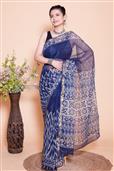The saree is blue with intricate silver patterns and designs. It has a mix of geometric and floral motifs in silver on a blue background, giving it an elegant look. There's also a border with detailed silver work. ??