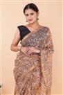 The saree in the image is brown with intricate white and gold patterns. It has a gold border and looks like it's made of a shiny, possibly metallic or embroidered fabric. The overall look is elegant and traditional, fitting for a photoshoot ??.