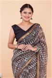 The saree in the image is brown with silver patterns and has a gold border. It also features ruffles along the length of the saree, adding a stylish touch. ??