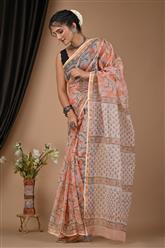The saree in the image is peach-colored with intricate patterns in shades of green, orange, and cream. It has a mix of floral and geometric designs, giving it a unique and elegant look. The saree also features a border that complements its overall design ??.