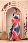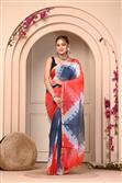 The saree in the image is a stunning blend of red, blue, and silver colours. It has a vibrant abstract pattern with shades of red and blue, complemented by intricate silver details. The saree is draped elegantly on the woman, adding to its visual appeal ??.