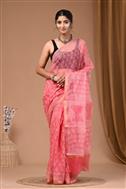The saree is pink with intricate white patterns all over it. It has a gold border at the bottom and seems to be draped elegantly by the woman in the image. ??
