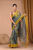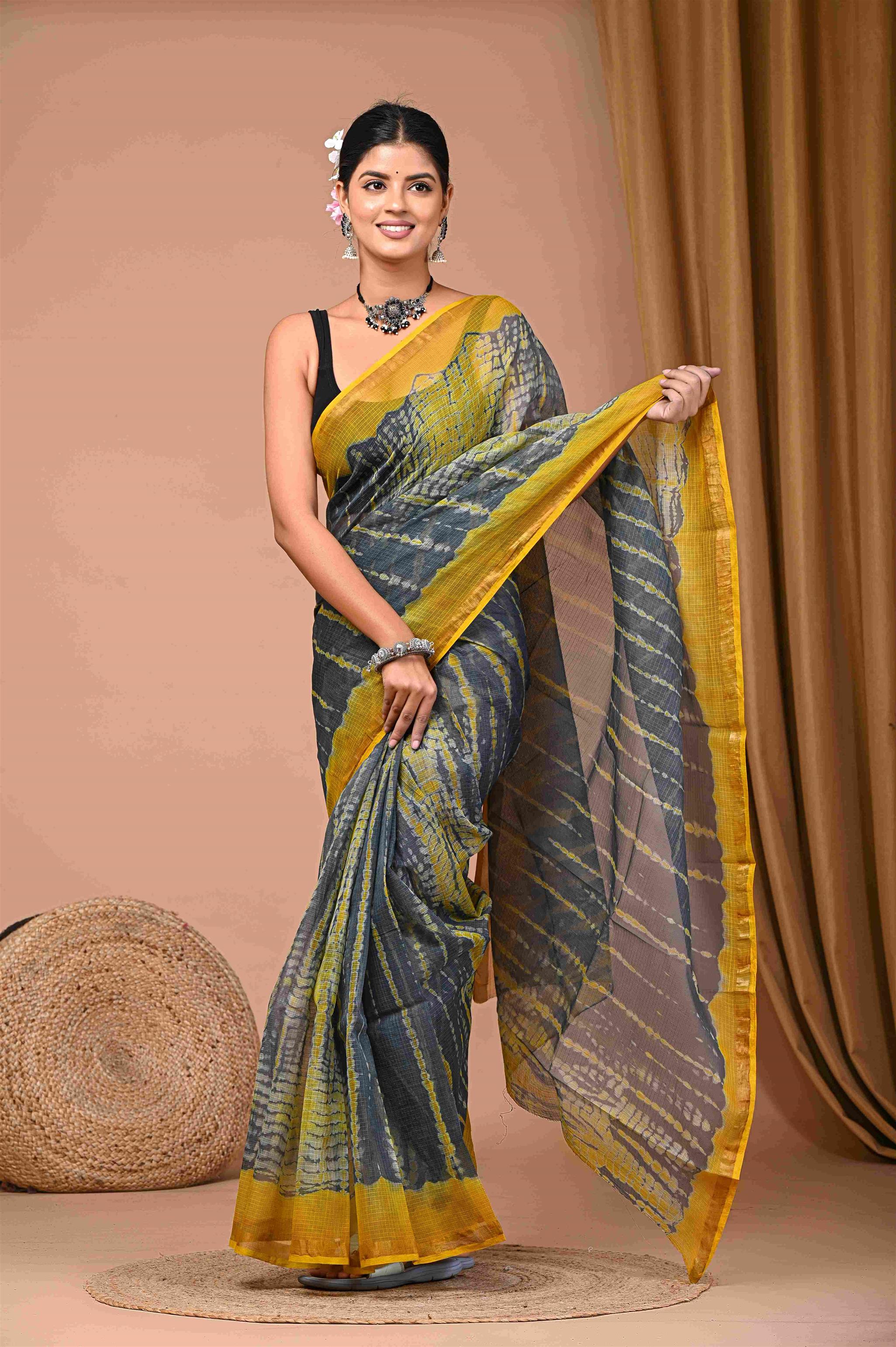 The saree in the image is primarily grey with yellow accents and patterns. It has a yellow border and features a mix of grey and yellow hues with some patterned designs. The saree looks like a traditional Indian outfit with intricate detailing, paired with a black sleeveless blouse. ??