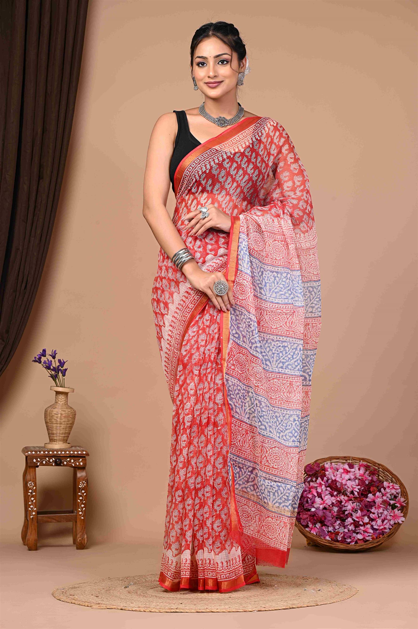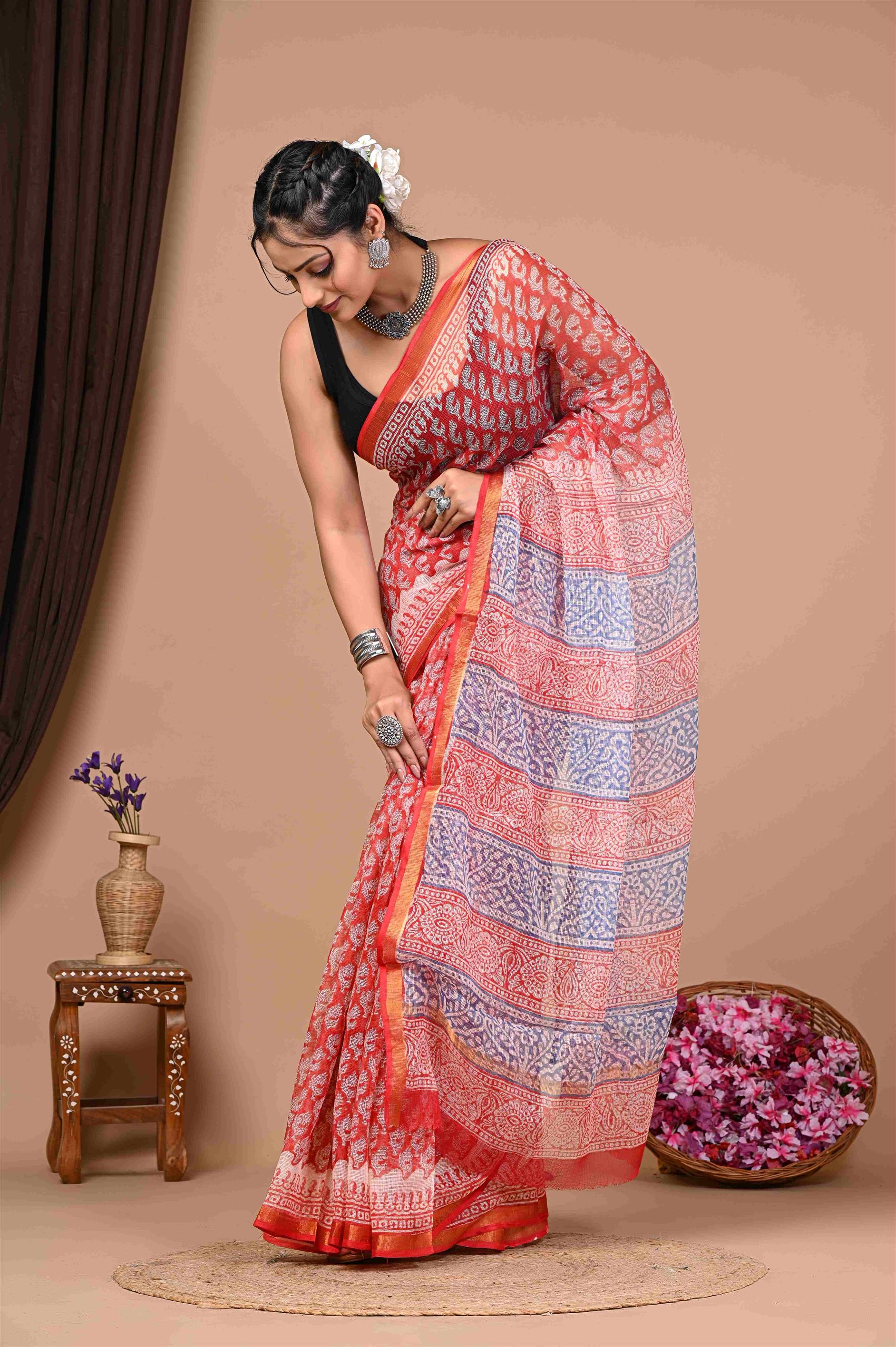 The saree in the image is predominantly red with white patterns and has a section with blue and white patterns. It has a red border and is draped elegantly by the woman. The saree seems to be made of a lightweight fabric, possibly chiffon or georgette, given its flowy appearance. The intricate white patterns on the red and blue sections add a touch of traditional elegance to the saree.