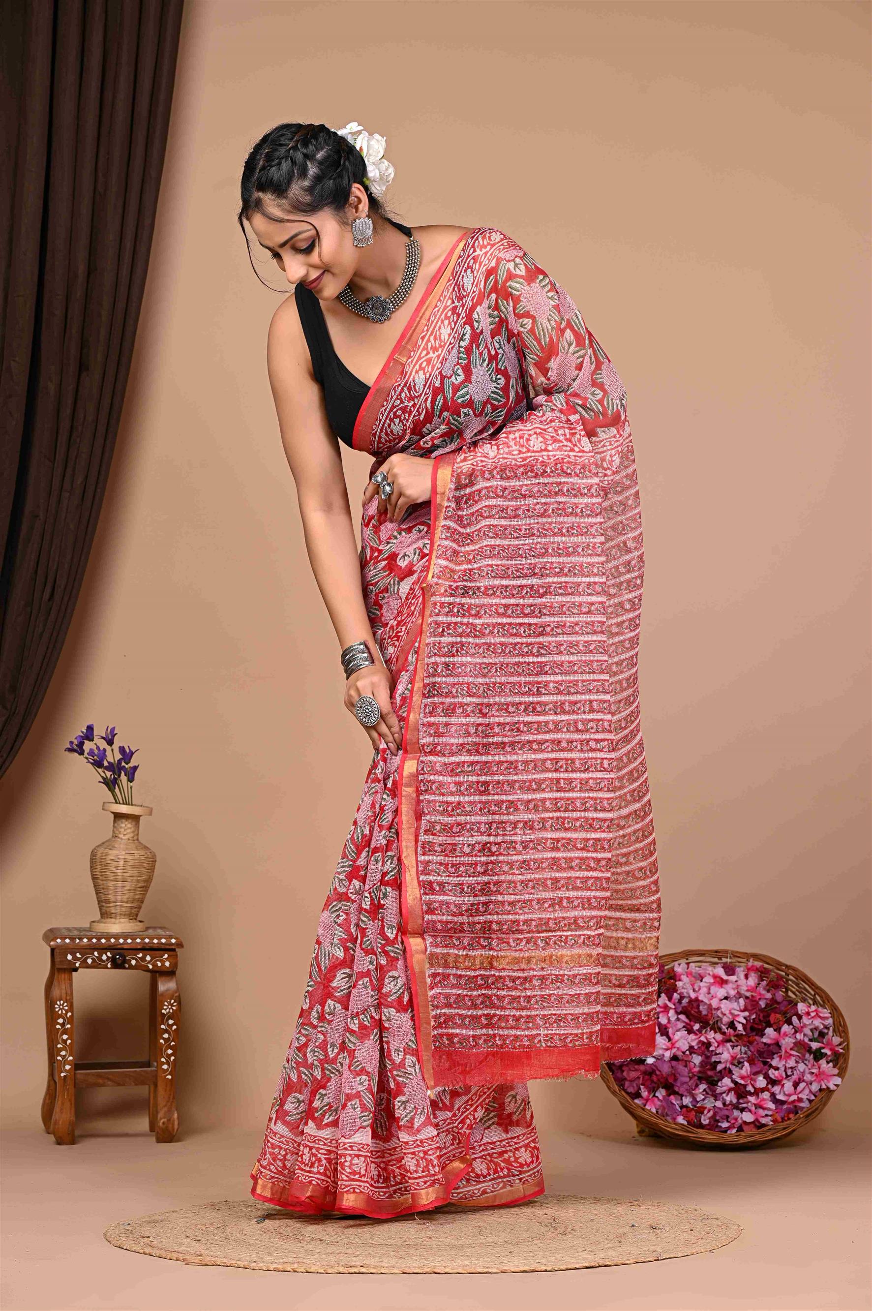 The saree is red with intricate silver and white floral patterns. It has a gold border at the bottom and a thin orange border along the edges. ??