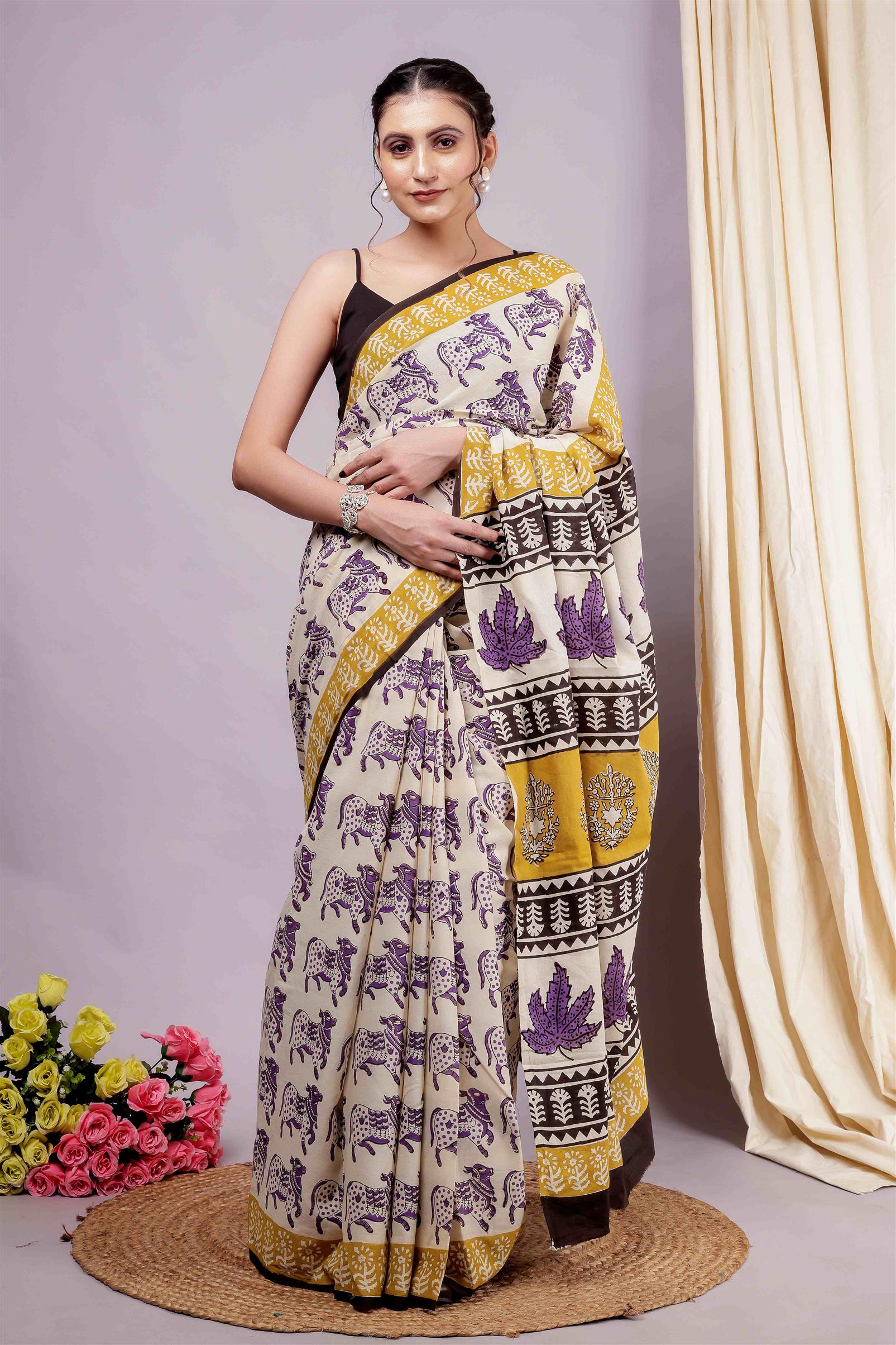 The image shows a woman wearing a traditional Indian saree with a mix of white, yellow, brown, and purple colours. The saree has patterns of elephants, leaves, and geometric designs. She's standing on a floor scattered with white flowers, with a basket of red flowers beside her against a peach-coloured background. ??