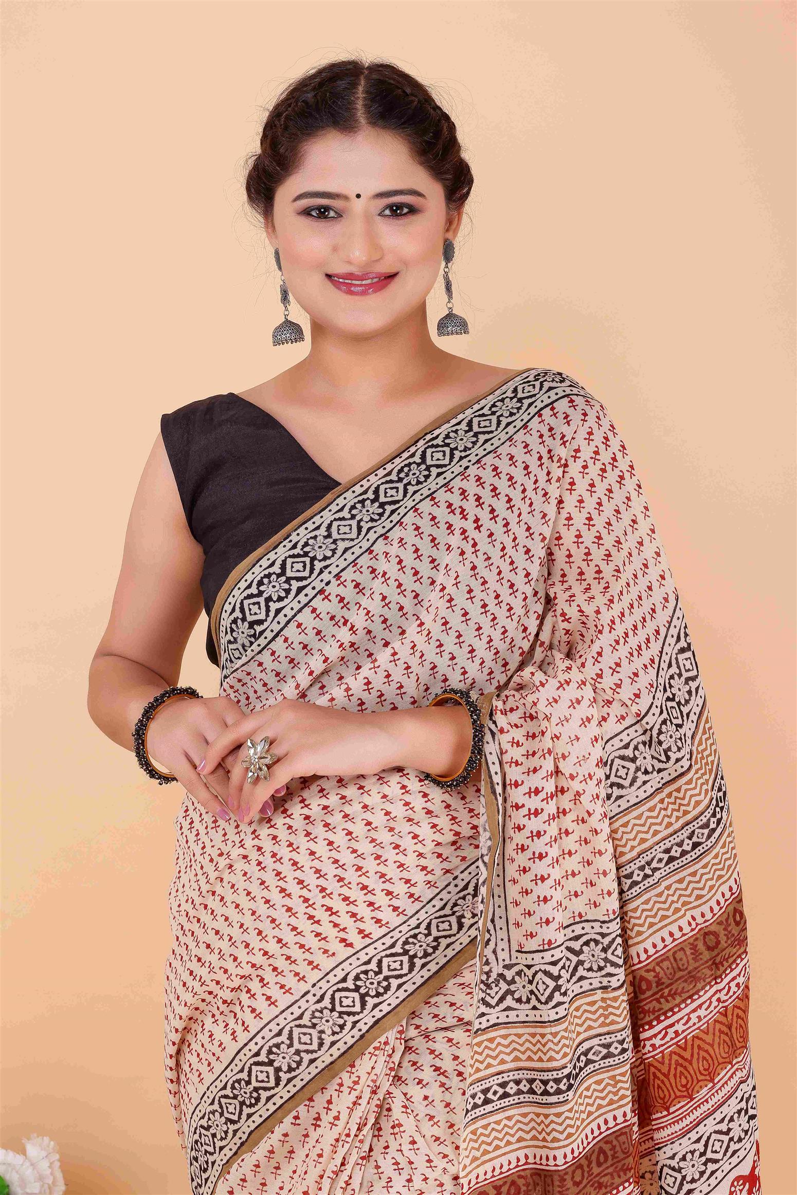 The saree in the image is primarily beige with intricate patterns and designs in shades of red, brown, black, and white. It has a mix of geometric and traditional motifs, adding a touch of elegance. The blouse is black, complementing the saree's earthy tones. The overall look is enhanced by the woman's accessories like silver earrings and bangles.
