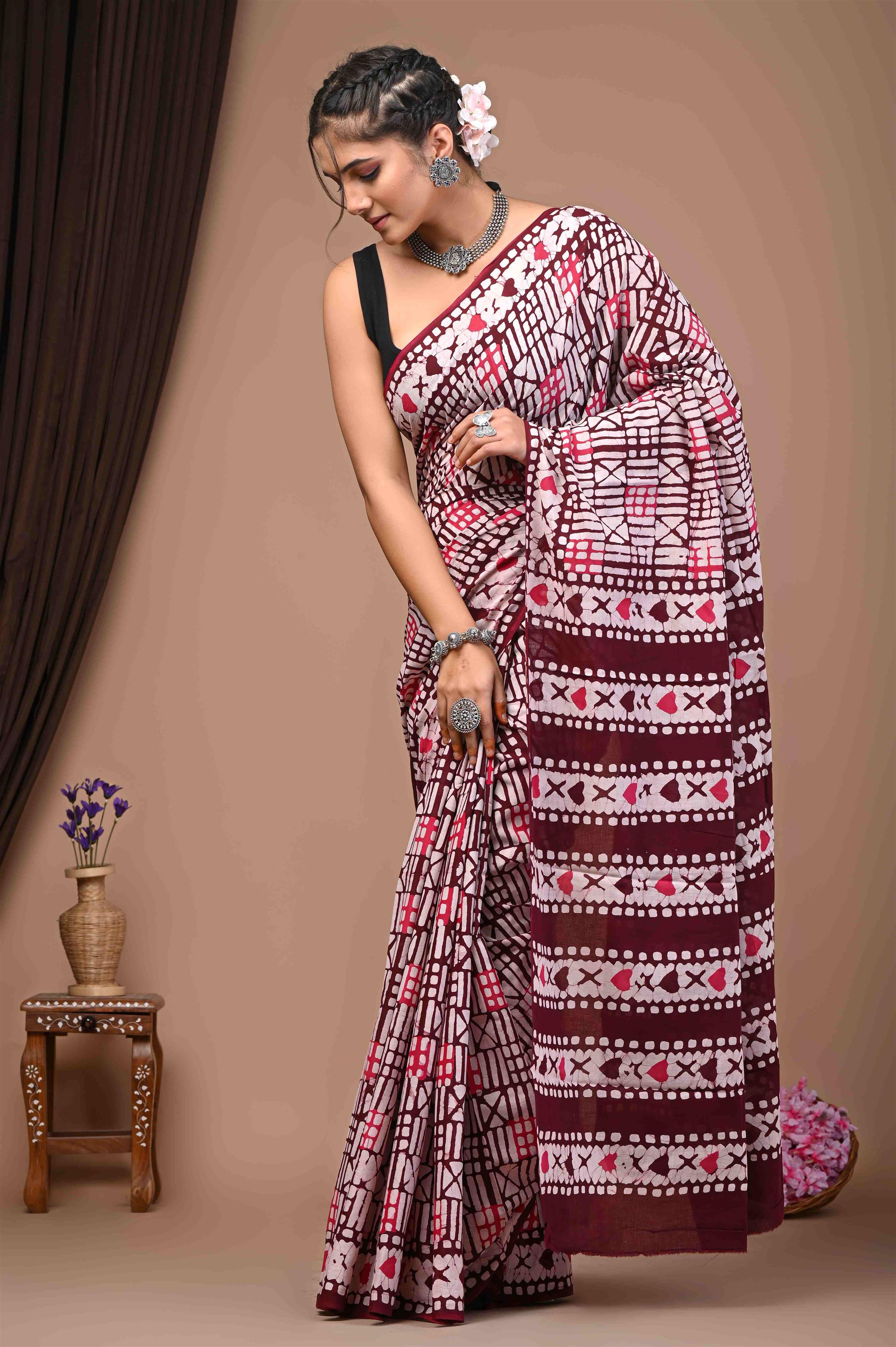 The saree in the image is primarily in shades of maroon, pink, and white with brown accents. It's a patterned saree with geometric designs and motifs. The woman wearing it has accessorized with silver jewellery like a bracelet, rings, and earrings. The saree has a striking pattern with lines, dots, and shapes in maroon, pink, and white on a predominantly white and maroon base.