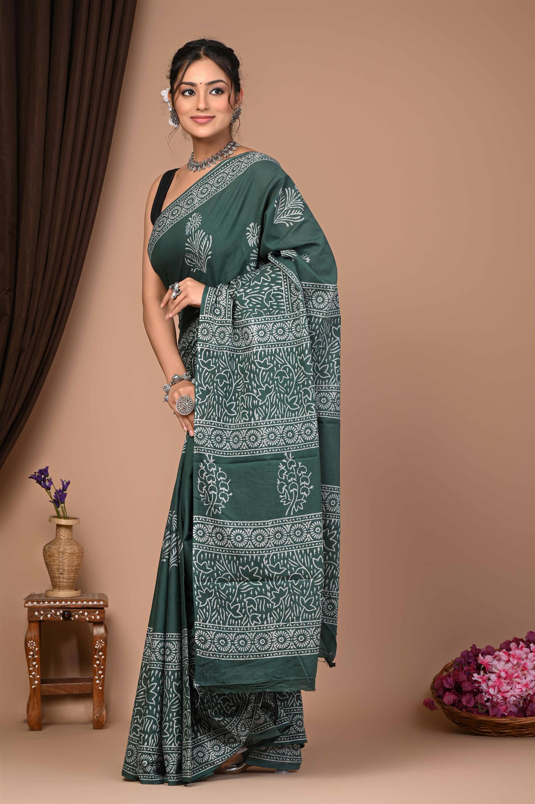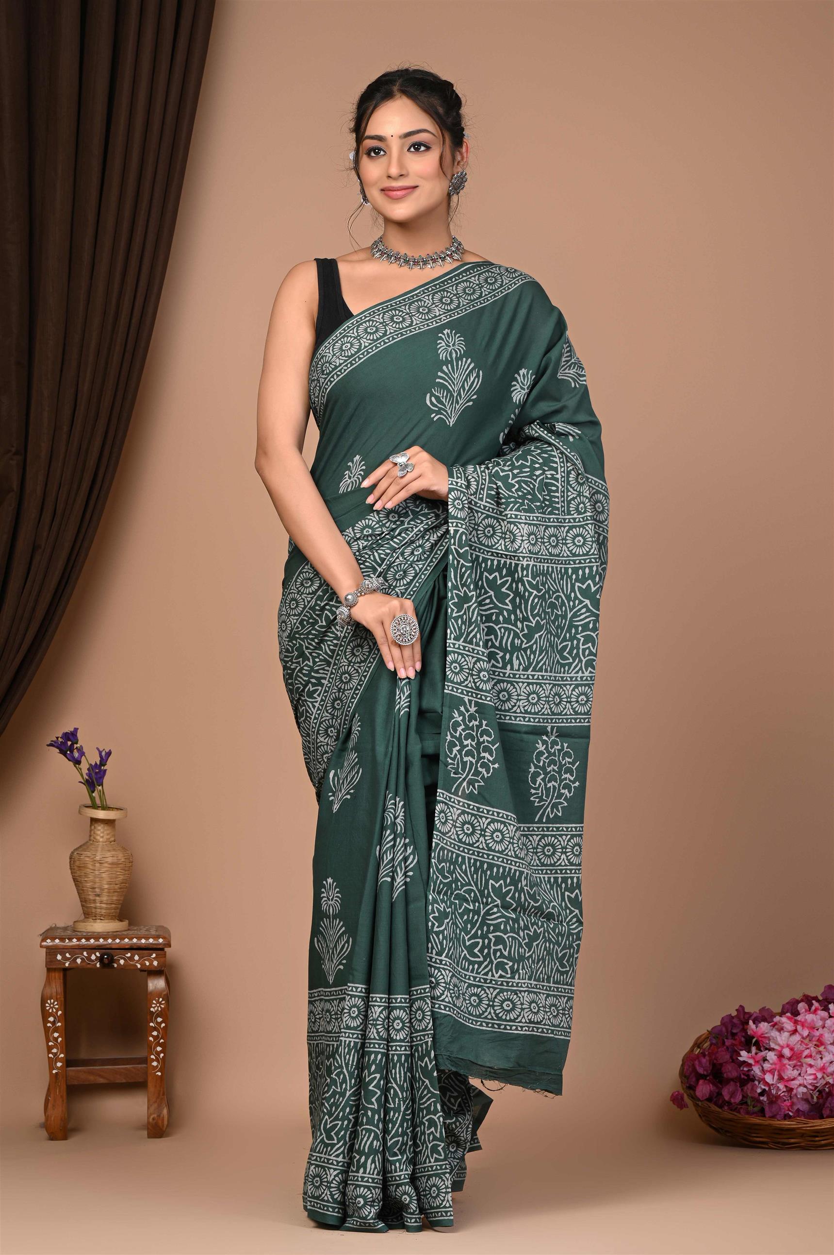 The saree is a dark green colour with intricate white designs and patterns printed all over it. It has a traditional look with detailed floral and possibly geometric motifs in white, giving it an elegant appearance. The saree is draped in a classic style, complemented by the woman's silver jewellery ??.