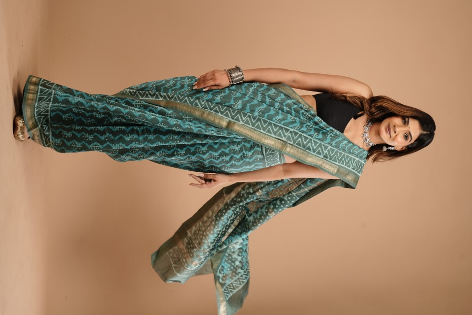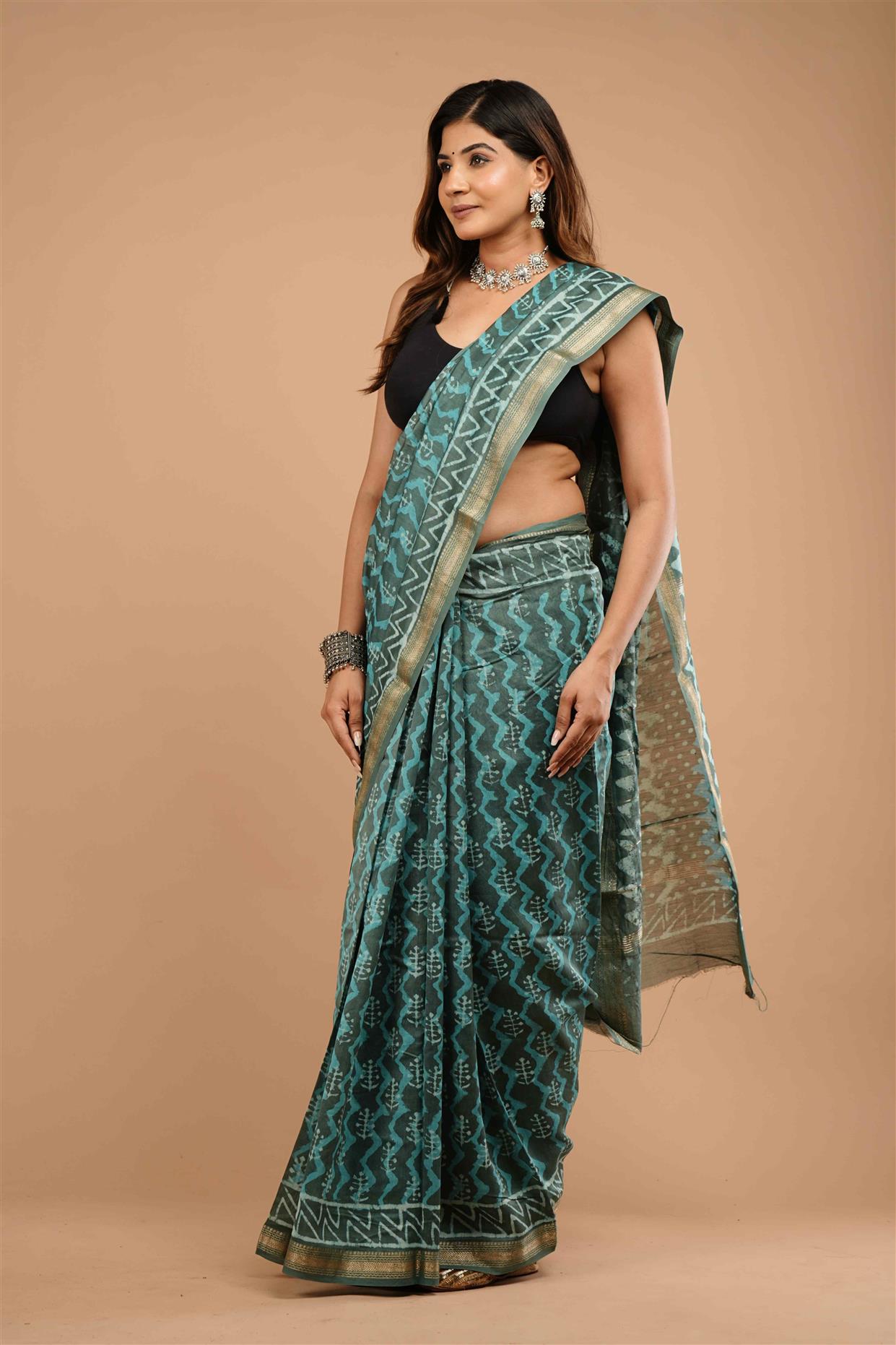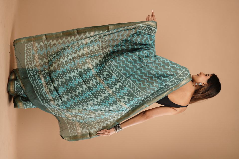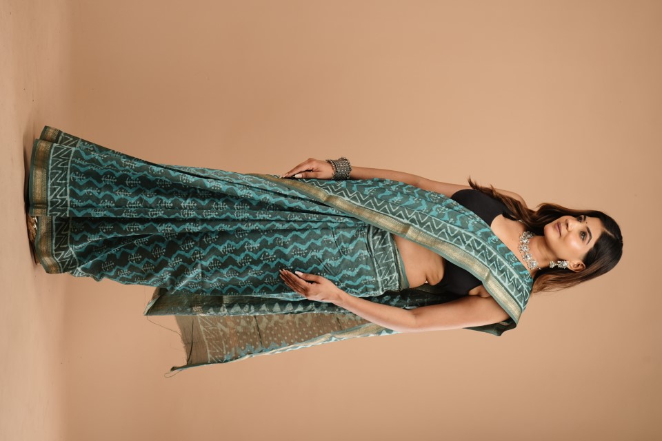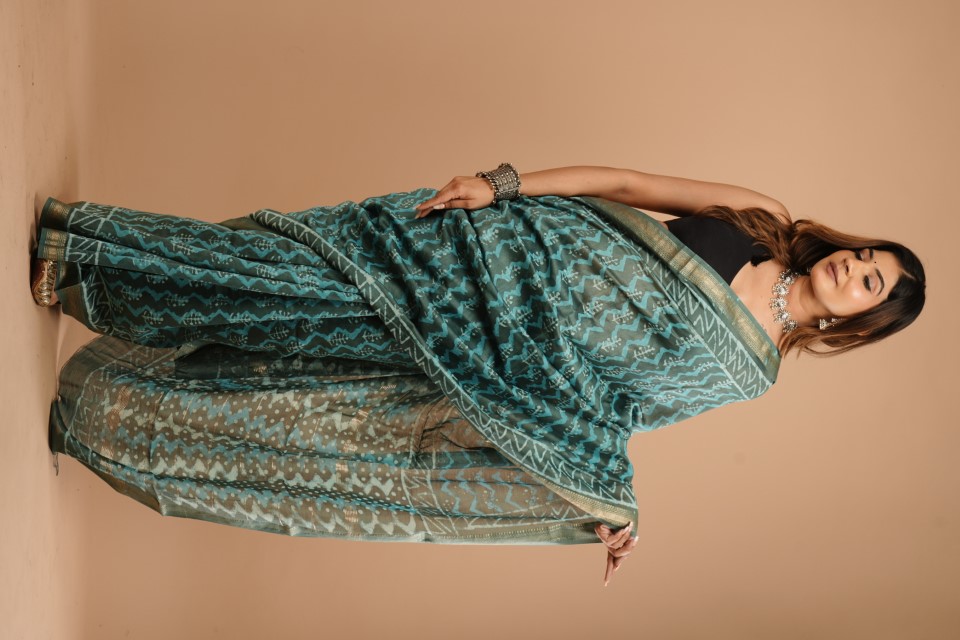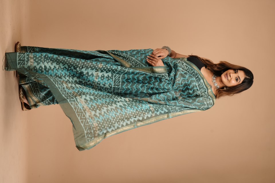 The Maheshwari silk saree in the image is a stunning teal green colour with intricate patterns and a gold border. The saree features a beautiful print with geometric and possibly floral motifs in lighter shades of green and gold accents, adding to its elegance. The woman is pairing it with a black blouse and some gorgeous silver jewellery ??.